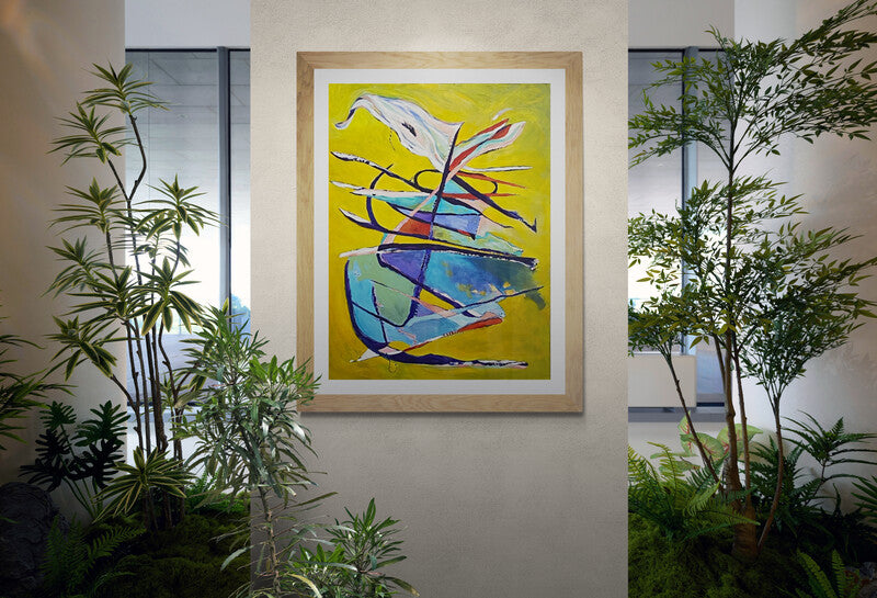 Here’s a painting that has two different display options. (This has happened once before, with my painting “Quantum Fishics”.) The first display option (vertical) is an abstract representation of a ship struggling to survive during a storm. Sails have been torn, rigging broken, but the captain is holding the wheel steady until the danger subsides.