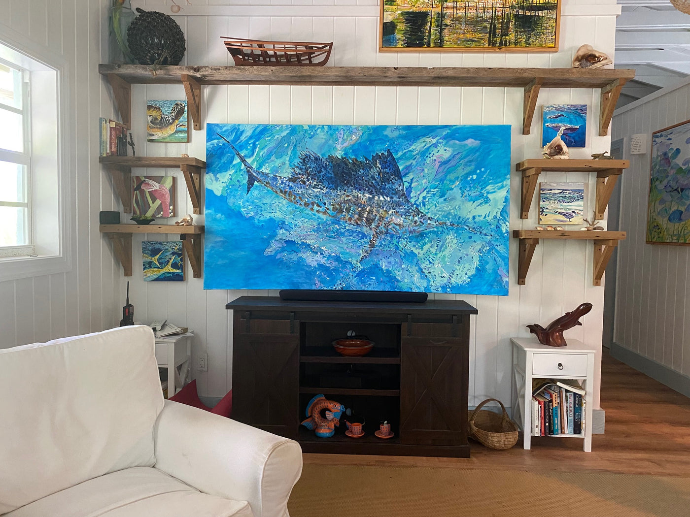 I painted Please Release Me from a reference photo (thank you,Greg Salsberg via Gerry Upthegrove) of a sailfish brought up alongside a boat—its body still in the water, except for the tip of its tail breaking the surface. It had fought hard. And though it may have been released, billfish often don’t survive the fight; the cost of that struggle can be fatal. That tension—between survival and surrender—became the undercurrent of this painting.