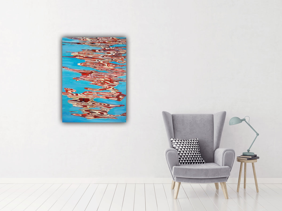The painting holds that moment when the water is doing more than mirroring — when it’s rearranging what it sees. Color gets pulled, thinned, doubled back on itself. The reflection becomes its own thing, separate from whatever caused it.