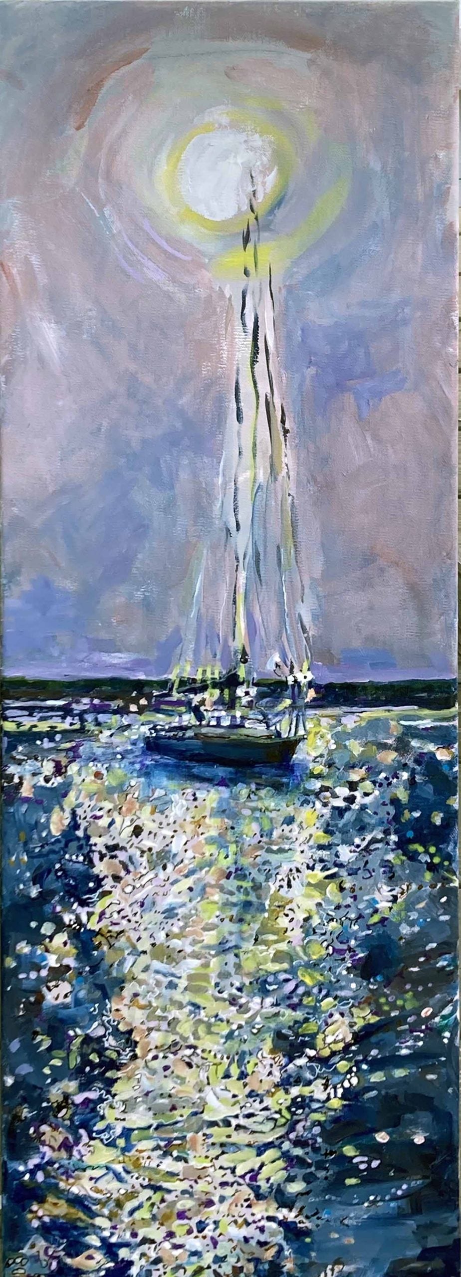 Its tall, narrow format reinforces that intimacy. This isn’t a painting that spreads out or invites company. It feels personal, almost inward-facing — something encountered briefly but remembered clearly. A pause rather than a destination. A moment you pass through on the way to rest.