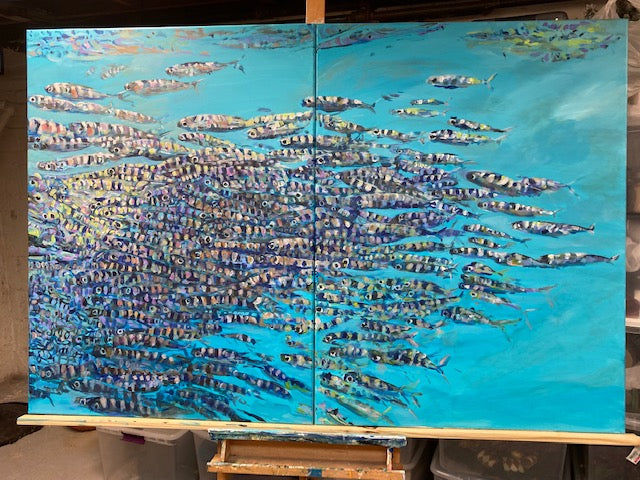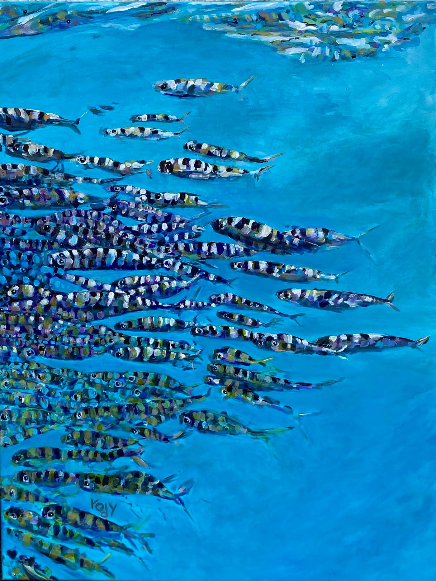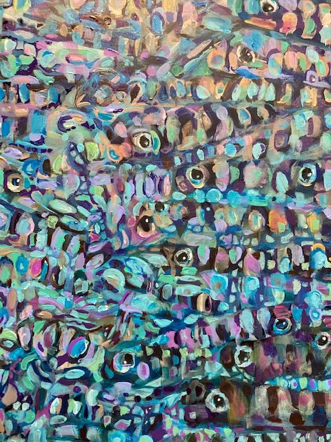 The painting operates in a space between realism and abstraction. At moments it becomes a school of fish. At others it becomes pure motion, color, and surface. Neither state dominates for long. The image drifts back and forth, resisting a fixed reading.