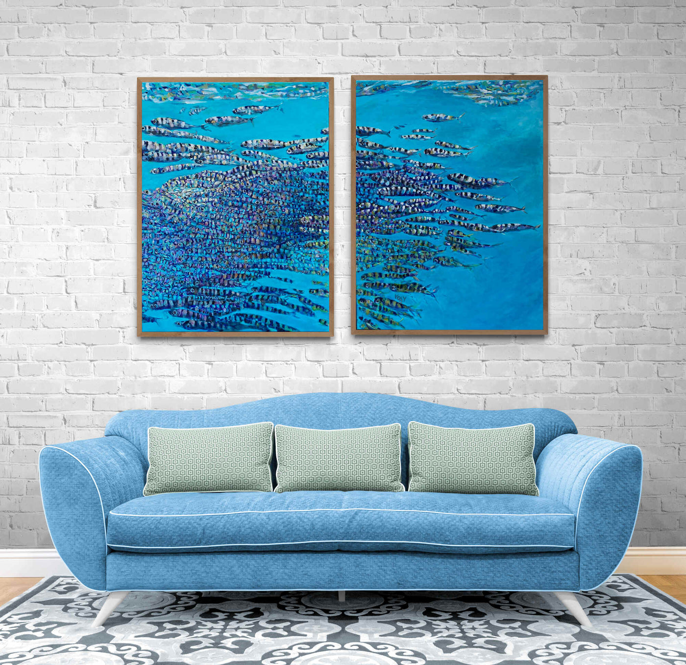 The Dreamway unfolds across two vertical panels that function as a single continuous field. A dense current of small, repeating forms moves from right to left, shifting from compression to openness, from saturation to space. At first glance the image reads as pattern. Gradually, eyes and bodies surface. Fish emerge, recede, and dissolve back into rhythm.